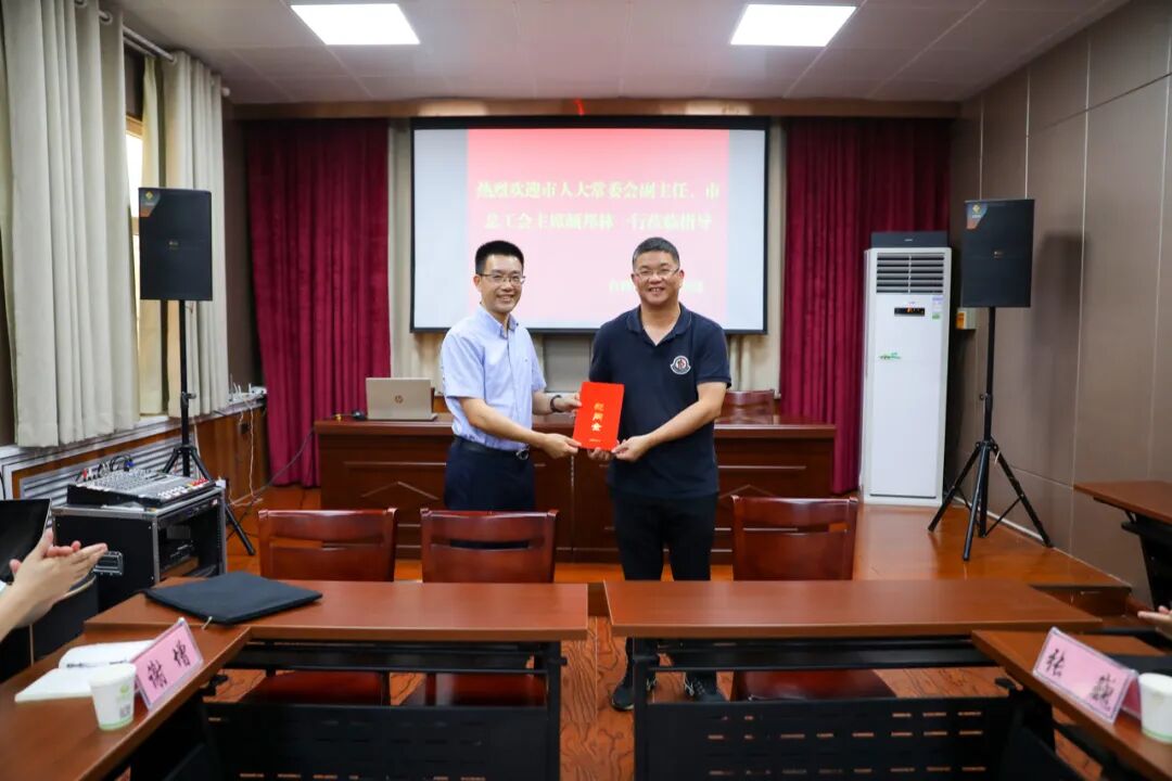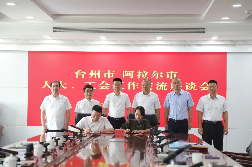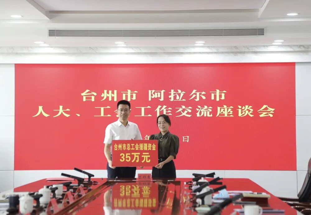 在交流座谈会上,台州市总工会、师市总工会签订意向书,并进行2022年援助资金交付仪式。