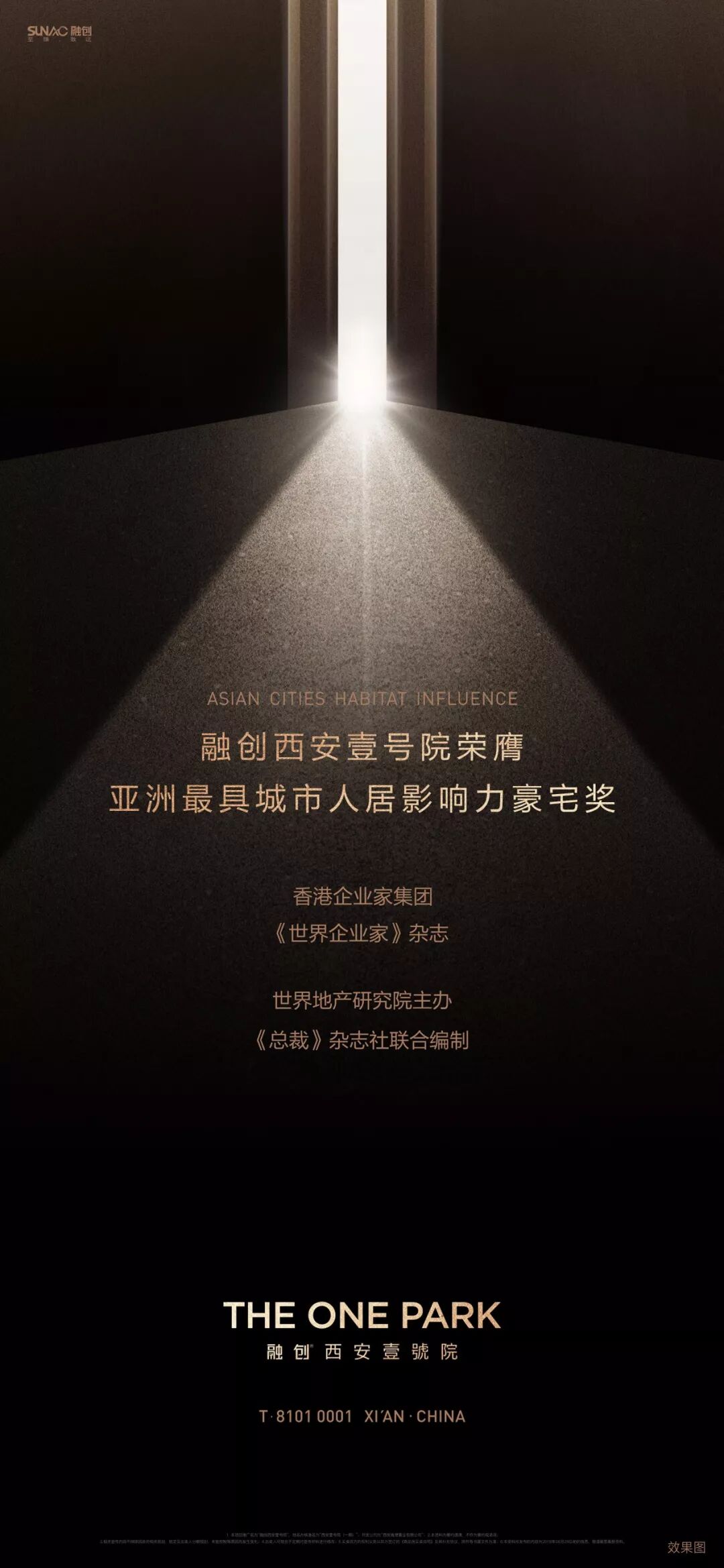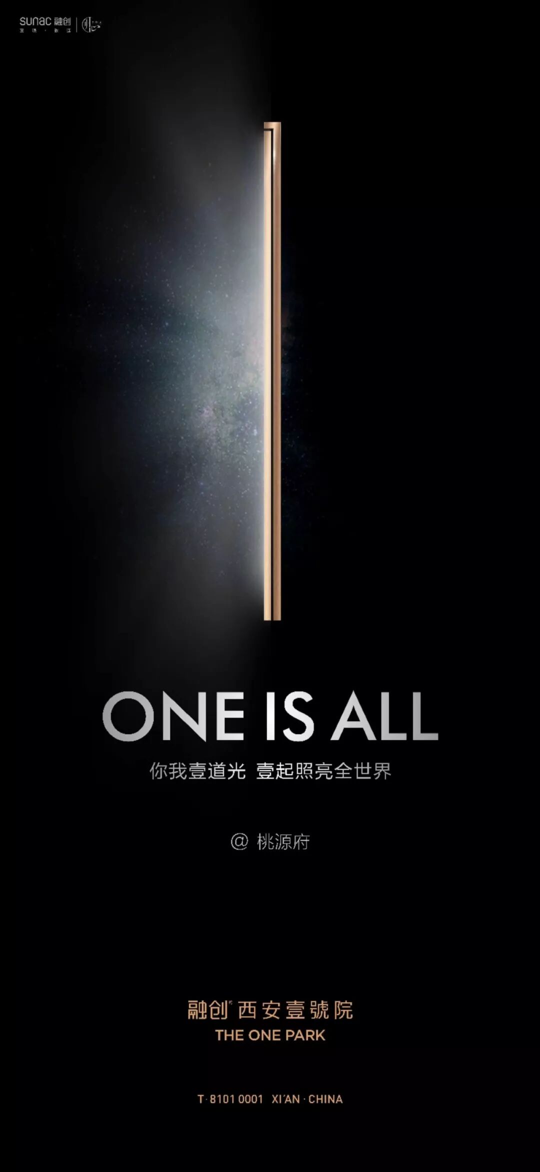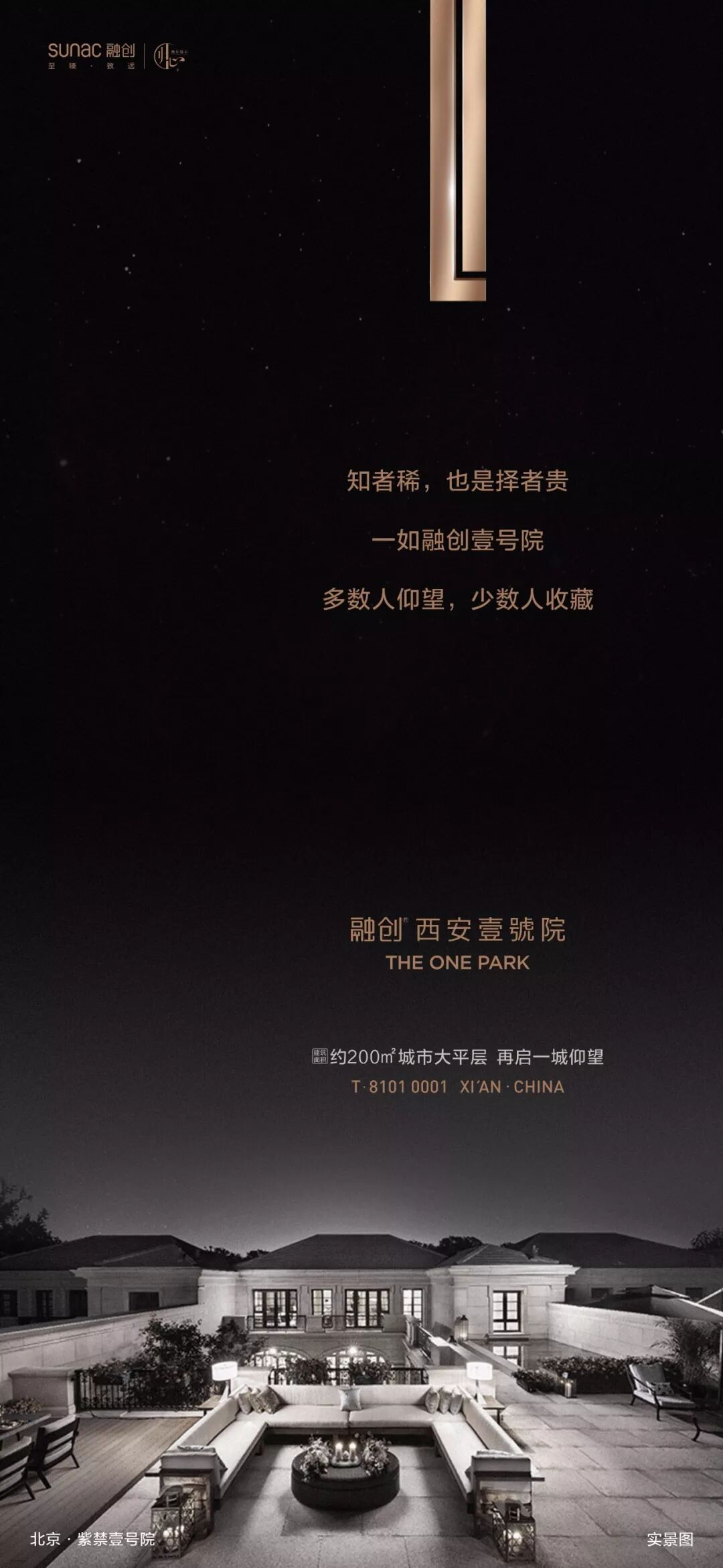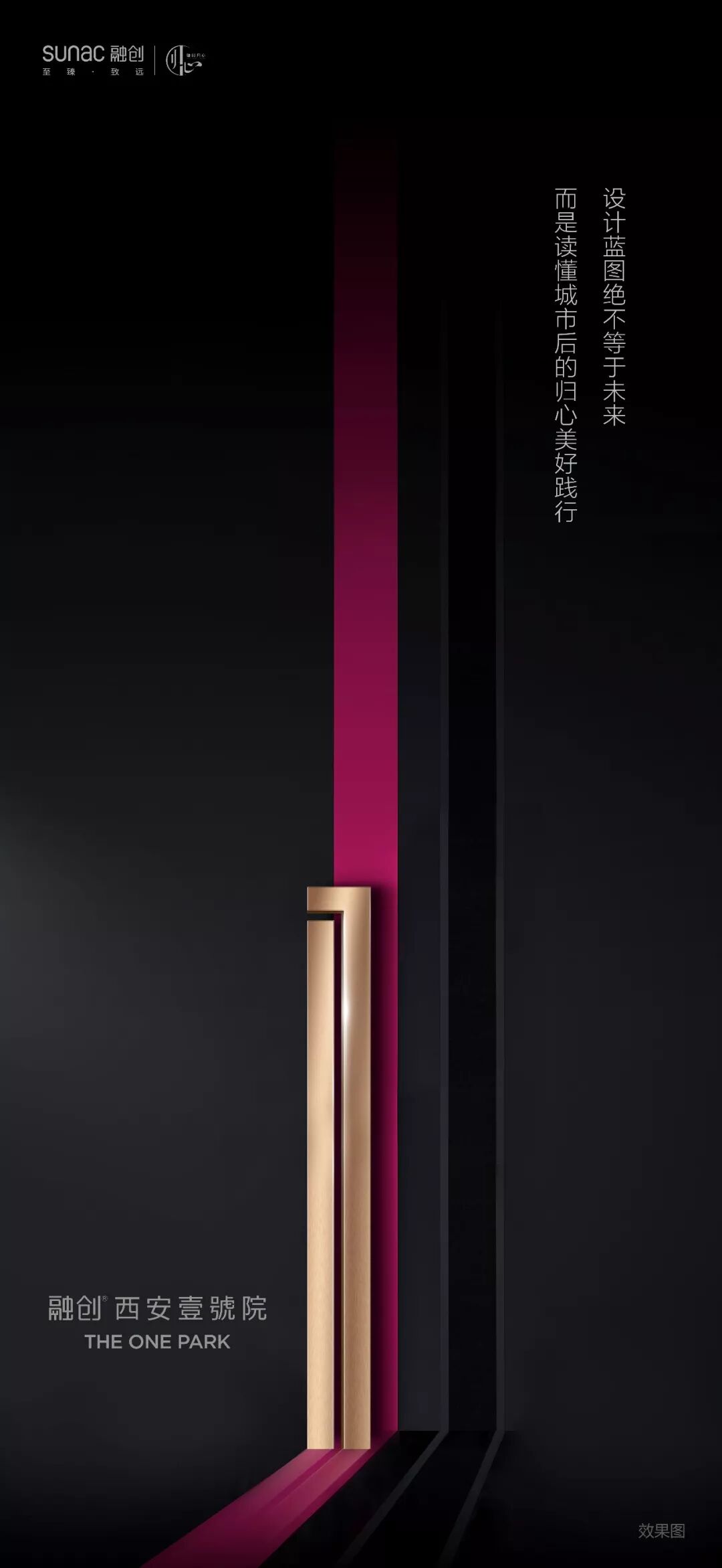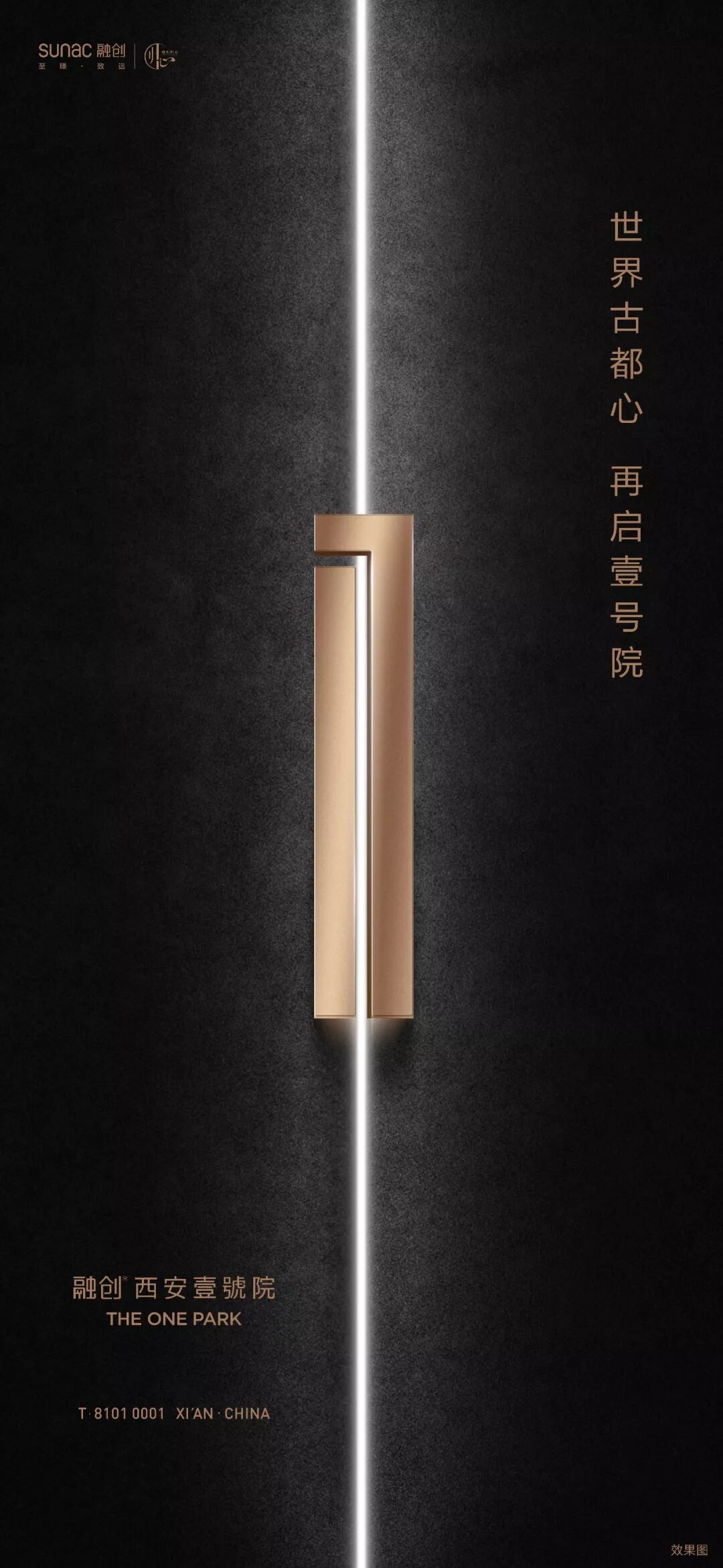 中国房地产市场,从来就没有过真正的风平浪静。尤其在当下产品同质化的年代,推广也陷入了同质化的桎梏当中。麦芒认为每一个项目都应该有它专属的“视觉故事线”。所谓“视觉故事线”绝不是板式的堆砌,更不是比谁的图更美,更漂亮。《道德经》中说:“万物之始,大道至简,衍化至繁。”极简艺术,是一种将简单做到极致的美,继而脱去世俗的繁杂色彩,还世界一个简单的一。在麦芒“视觉故事线”理论重要的一点:不过度渲染华丽的色彩,也不去堆砌繁杂的元素,简约而不简单,让视觉回归纯粹的本质。因此在本案“壹”的视觉故事线基础上,麦芒要做的是如何去繁就简,实现新阶段视觉传达的迭代。所谓“壹”的哲学本义指:专一纯粹、专精。《中华心法》阐述一:一者,谓专精也,用心一也,专于一境也。谓之不偏、不散、不杂、独不变也,道之用也。故君子执一而不失,人能一则心纯正,其气专精也;人贵取其一,至精、至专、至纯,大道成矣。此自然界生产力之不二法则。《荀子·大略》中有“君子壹教,凝子壹学,亟成”。因此,麦芒在全新阶段的视觉创作中,取“壹”的哲学本义,以不偏、不散、不杂的要义,采用硬朗挺拔的汉字笔画“竖”,对分劈开,巧用光的结合,留给读者意犹未尽,却仍有无限遐想空间。此外,从本案地段“十六王宅”的基址出发,深入探究中国府院文化,试图为视觉故事线赋予浓厚的文化底蕴。国人讲究“锦衣荣归”,更注重归家礼序的仪式感。依据此,麦芒便从中式建筑中“院门合开,礼迎归家”采撷设计元素,也就是下图又有看似“门栓”的主视觉符号。一个回归传统,又兼具世界极简审美气质的视觉表达,于此正式呈现出来。