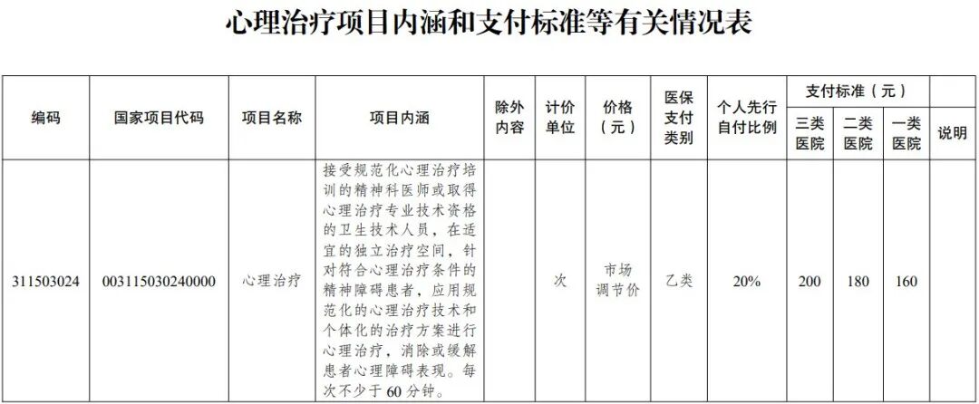 为贯彻落实《江苏省精神卫生条例》,更好满足参保患者心理治疗的临床需求,减轻群众医疗费用负担,经研究,决定将“心理治疗”项目纳入医保支付范围,并在全省统一执行,现就有关事项通知如下:一、明确“心理治疗”项目内涵。本通知所指“心理治疗”为“接受规范化心理治疗培训的精神科医师或取得心理治疗专业技术资格的卫生技术人员,在适宜的独立治疗空间,针对符合心理治疗条件的精神障碍患者,应用规范化的心理治疗技术和个体化的治疗方案进行心理治疗,消除或缓解患者心理障碍表现。每次不少于60分钟”。二、调整“心理治疗”项目医保支付类别。将《江苏省基本医疗保险诊疗项目和医疗服务设施范围及支付标准》中心理治疗(311503024)项目纳入医保支付范围,支付类别从“丙类”调整为“乙类”。三、统一“心理治疗”项目医保支付标准。全省执行三类、二类和一类收费政策的定点医疗机构“心理治疗”项目医保支付标准分别为200元/次、180元/次和160元/次。参保患者在定点医疗机构接受心理治疗,实际收费低(等)于医保支付标准的,由医保基金按规定予以支付,其中,个人先行支付比例为20%;实际收费超过医保支付标准以上的部分由患者负担。