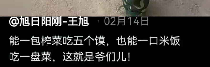 “能一包榨菜吃五个馍,也能一口米饭吃一盘菜,这就是爷们儿!”