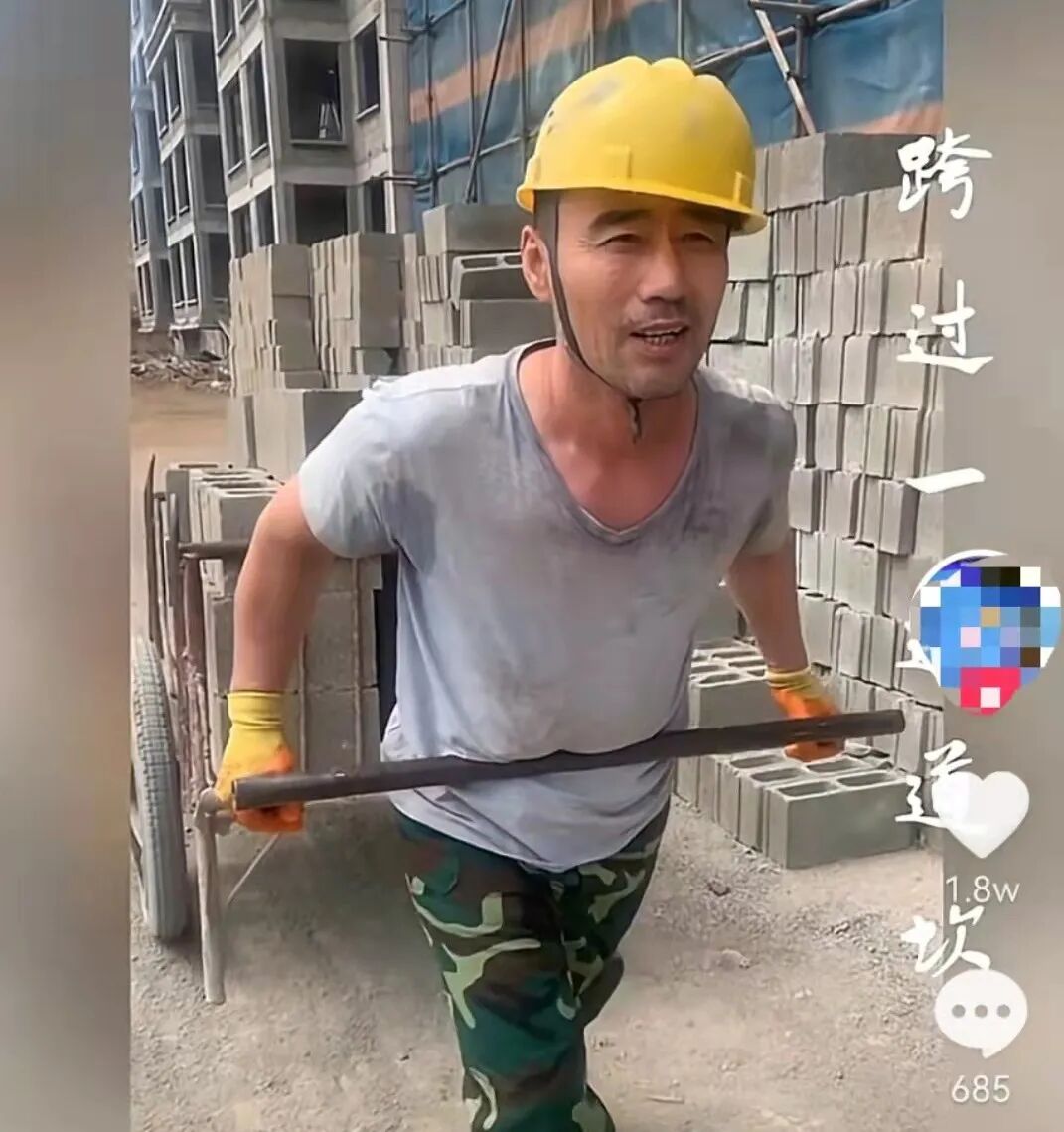 此时的他,头戴安全帽,正吃力地拉着一车砖。