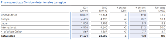制药部门:上半年营收为217亿瑞士法郎,下降了3%,主要受疫情和仿制药竞争冲击;其中Q1受到新冠疫情严重冲击下降9%,Q2单季度有所恢复,增长4%。分区域来看: