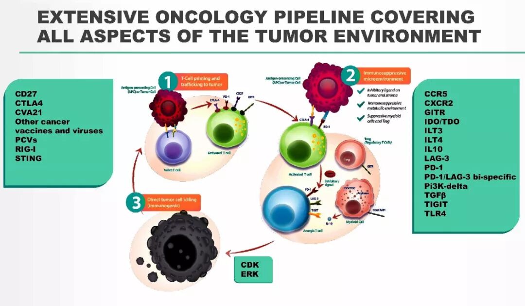 在早期肿瘤研发管线方面,默沙东分为3个大方向:首先是专注于T细胞Priming和Trafficking方面的药物,目前有7个项目,包括CD27,RIG-1,STING等靶点。其次是专注于肿瘤微环境的药物,有14个项目,包括GITR、TGFβ、TIGIT和PD1 x LAG3 双抗等。最后,默沙东还有两个早期资产,是可直接杀死癌细胞的药物,靶点为CDK和ERK。下图详细介绍了以上信息: