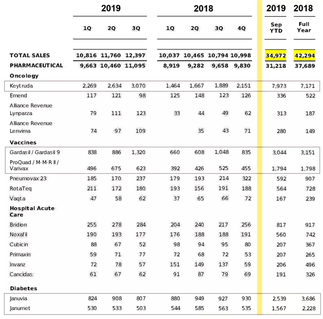 默沙东2018-2019年七个季度的主要药品销售额比对