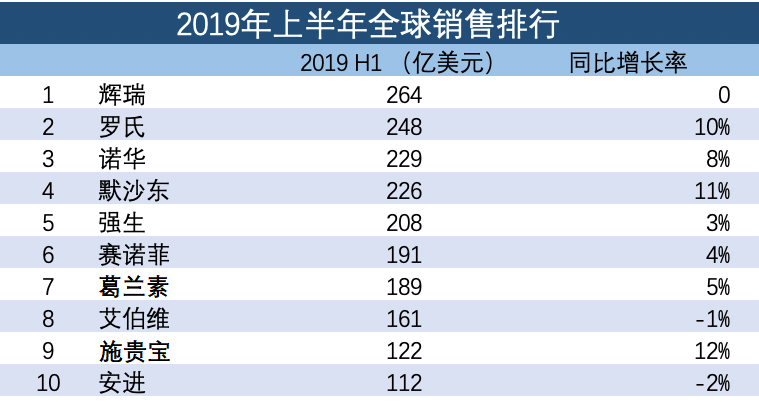 八年时间,如白驹过隙。弗雷泽呈交上了一份什么样的成绩单呢?我们先来看一下2019年上半年全球十大药企单算药品的销售排行: