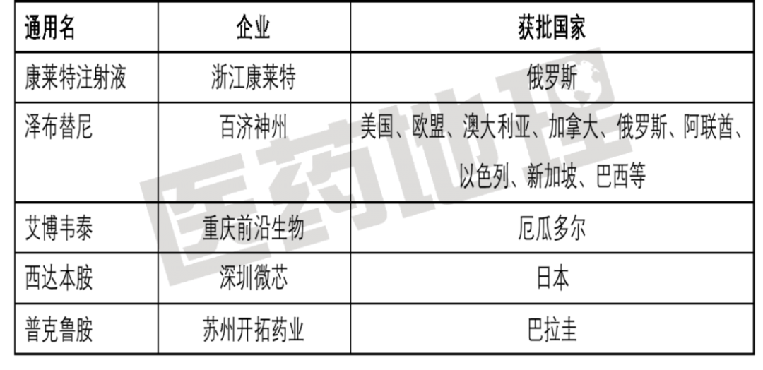 据【智能药物大数据分析平台Pharma ONE】统计,目前成功在国外获批的本土创新药共有5款(不包括新冠疫苗,也不包括国外原研授权给国内药企开发的产品),具体名单请见表1。