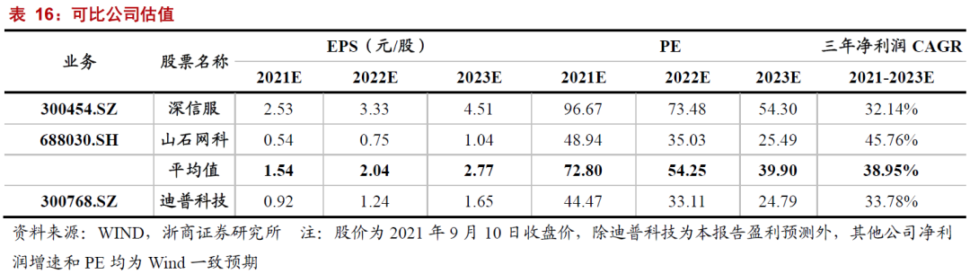 根据Wind一致预期,2021年9月10日,深信服、山石网科2021-2023年PE估值的平均值为72.8倍、54.25倍、39.9倍,平均三年净利润CAGR为38.95%。
