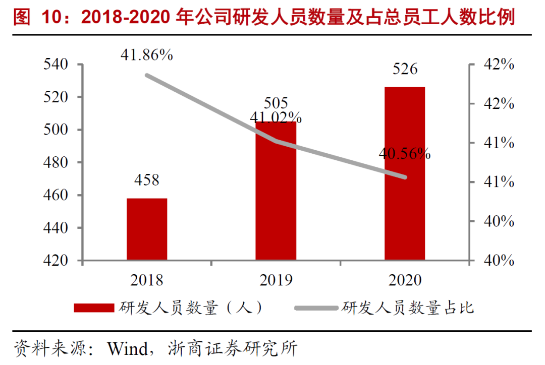 (1)2018-2020年,公司研发人员数量占总人数比保持在40%以上,且人数持续增长,2020年达到526人。