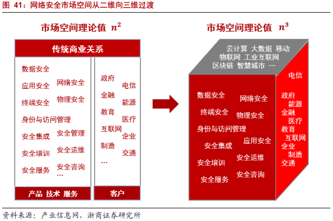 技术层面,“云大工物移智”等新技术和新场景不断拓展网络安全边界。随着移动互联、云计算、大数据、物联网和工业控制等新技术、新应用领域持续发展,从本地数据中心到云端再到边缘端,安全的传统边界被打破,以防为主的被动防御安全策略渐渐失效,网络安全产业的覆盖面也不断扩大,网络安全市场由“网安+行业领域”的二维市场扩展到“网安+行业领域+新兴技术”的三维市场,围绕网络和数据信息的应用和服务呈快速增长的格局。