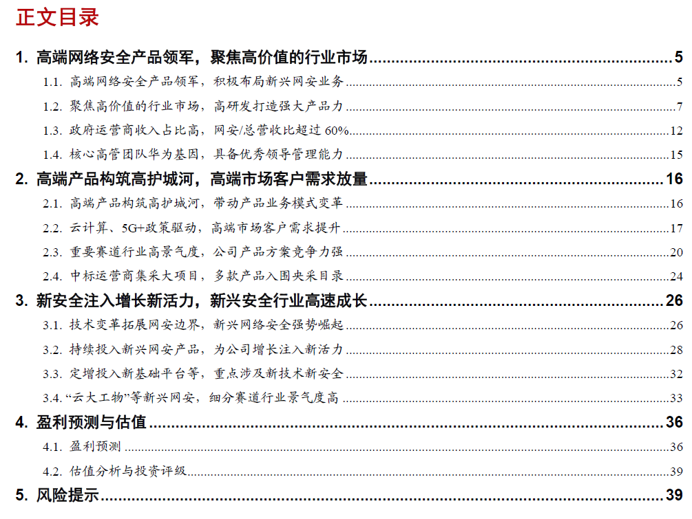 公司是国内高端网络安全产品领军企业,构筑起高护城河,高端客户市场需求放量,业务增速迎拐点;持续拓展新兴安全,为增长注入新活力。