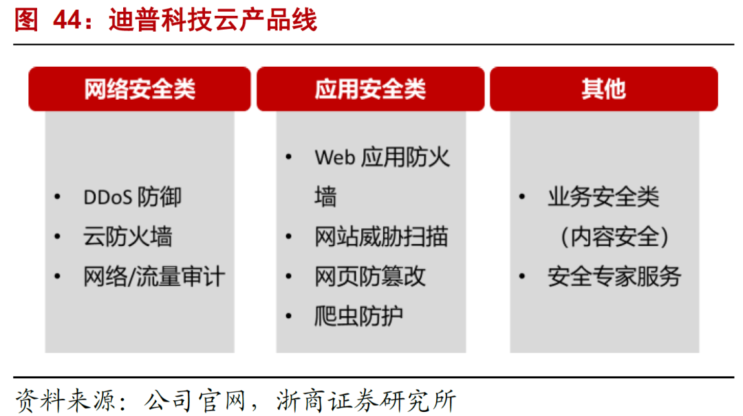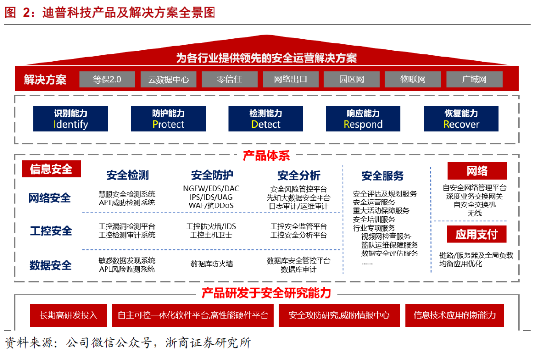 迪普科技是主要提供高端性能网络安全产品的领军企业,产品包括网络安全产品、应用交付产品、基础网络产品、服务业务等,网络安全产品业务是公司最核心的业务,包括应用防火墙(FW)、入侵防御系统(IPS)、抗DDOS等产品线。