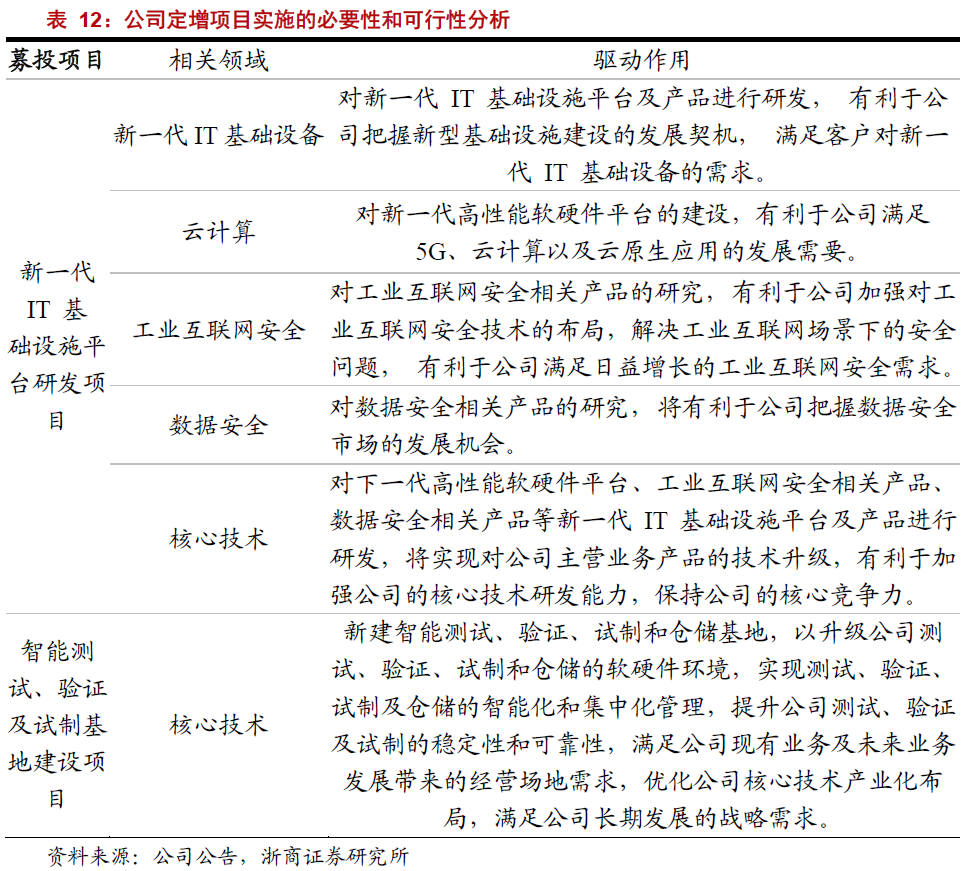 定增10.15亿元,用于IT基础设施是和测试基地相关项目,其中新一代IT基础设施平台研发项目重点涉及云计算、工业互联网安全、大数据安全等新兴领域。2021年3月,公司发布定增公告(注册稿),向不超过35名发行对象发行不超过4000万股公司股票,拟募资10.15亿元,用于新一代IT基础设施平台研发项目及智能测试、验证及试制基地建设项目。发行目的主要是: