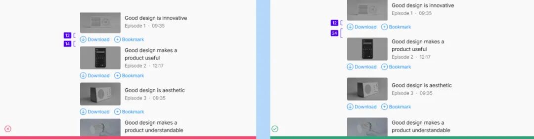 对比很重要。当上下两组元素的间距过于接近时,会导致用户认知逻辑的混乱。如果要使两个间距值不同,那么就留有足够的间距加强对比。![]()