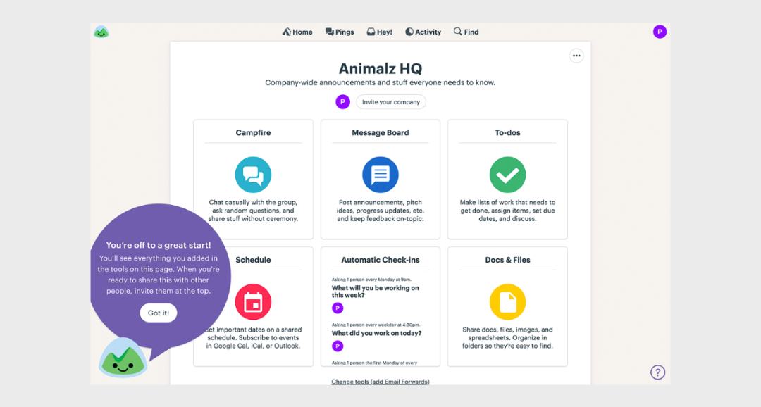 ▲ Basecamp通过提供一个简单的选择面板和友好的指南,突出了新用户在首次使用时要注意的核心要素。