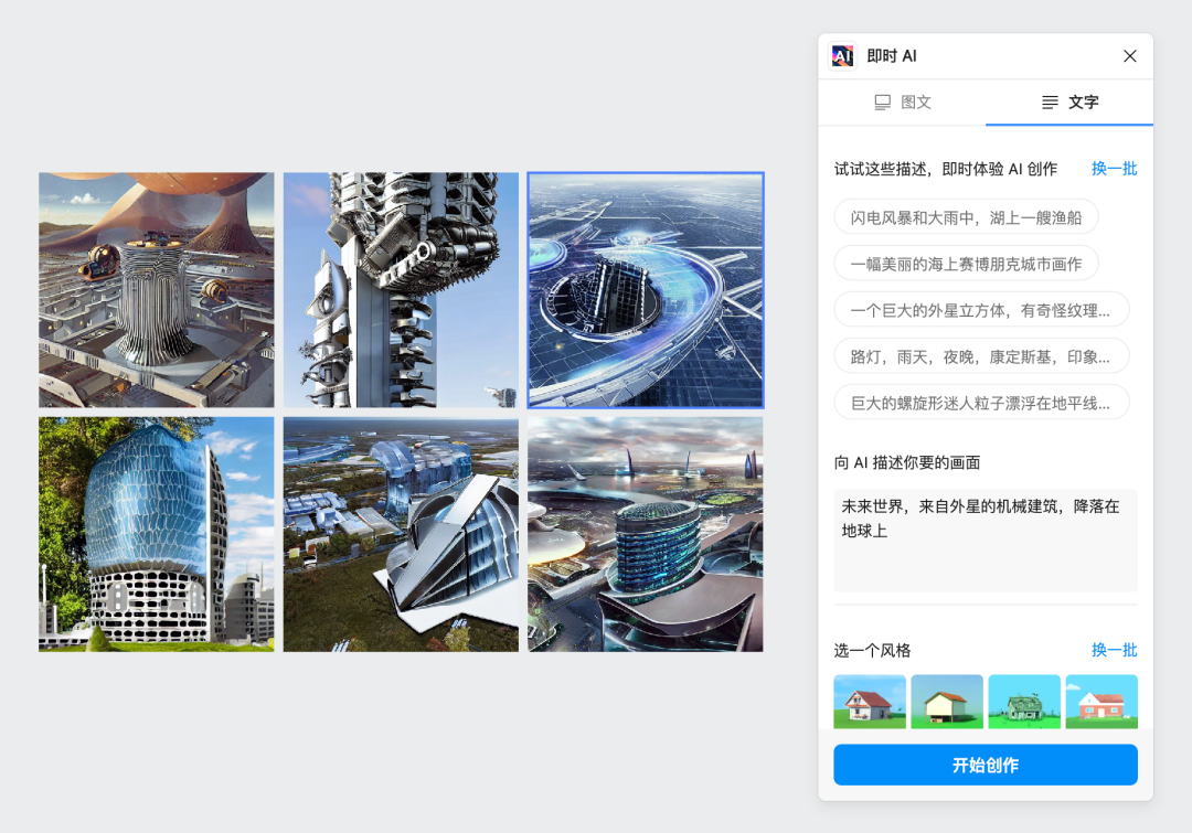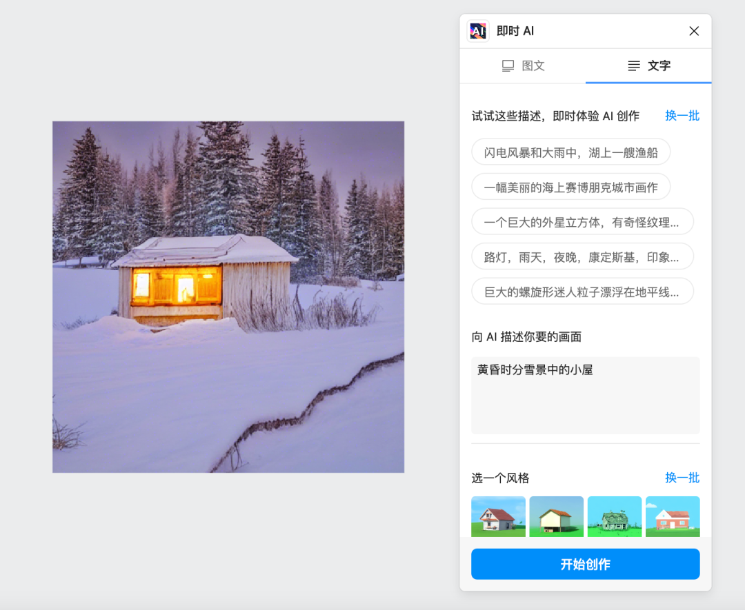 「即时设计」有上百个插件,诸如:图片滤镜、图像效果编辑器、智能抠图、AI 擦图等插件,可以在 AI 绘画的基础上,进行更进一步的图片创作。比起其他的 AI 绘图,即时 AI 简单到只需要 3 步就能绘图。第一步:打开即时设计(https://js.design),登录或注册新账号;第三步:使用图文生成 AI 绘画或者选择文字描述生成 AI 绘画![]()