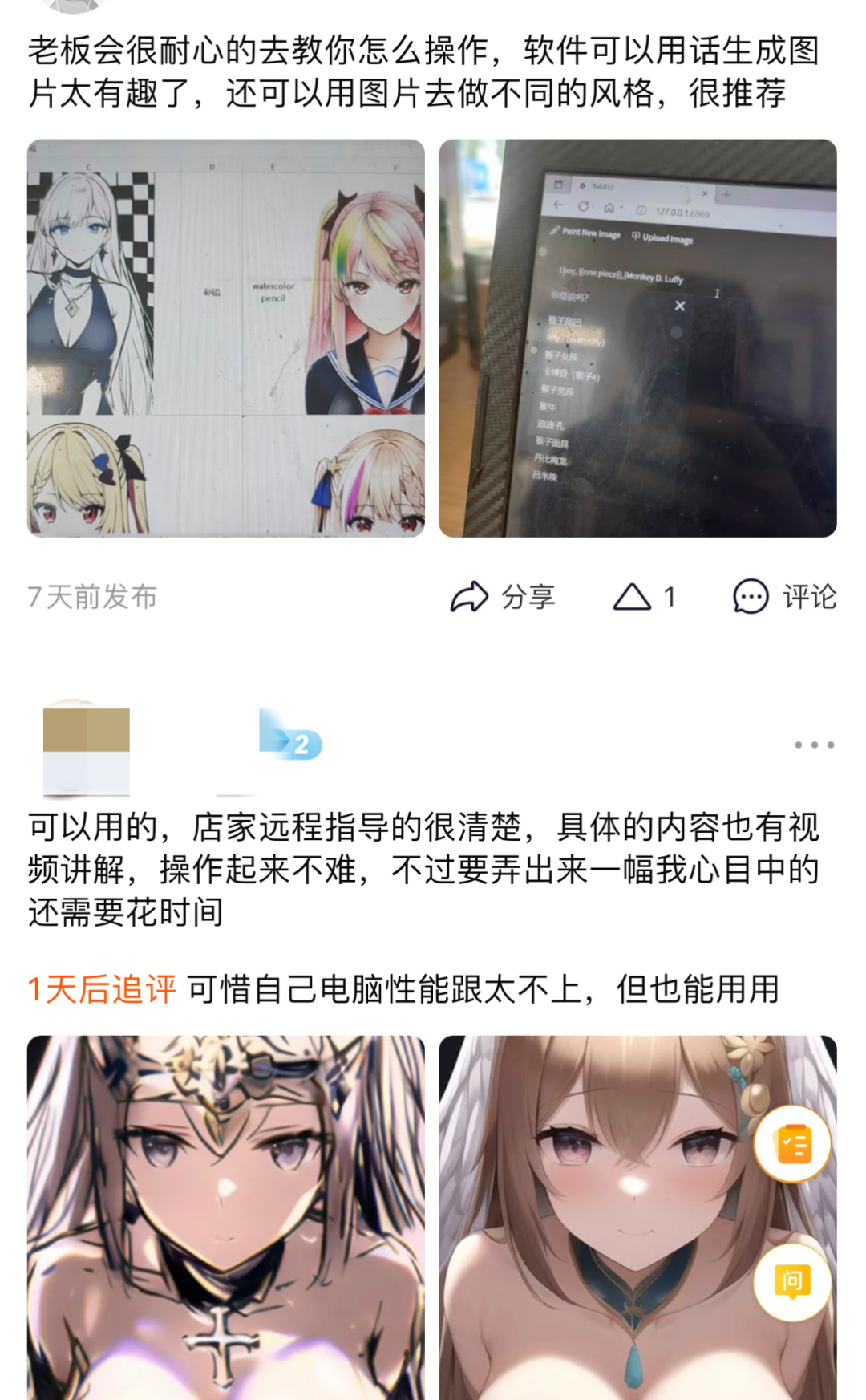 两位买家评价电商平台上一个出售AI绘画工具+指导教程的店铺。如果是在设圈的话,“亲妈”一天可以用AI工具自己画几百张图……