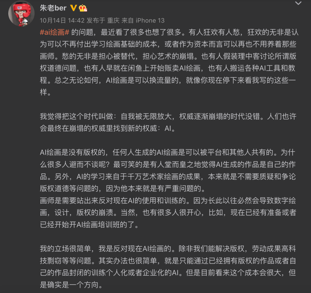 生于美术世家、《大圣归来》美术指导朱晴在微博发表对AI绘画的看法
