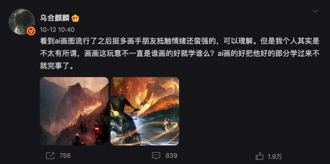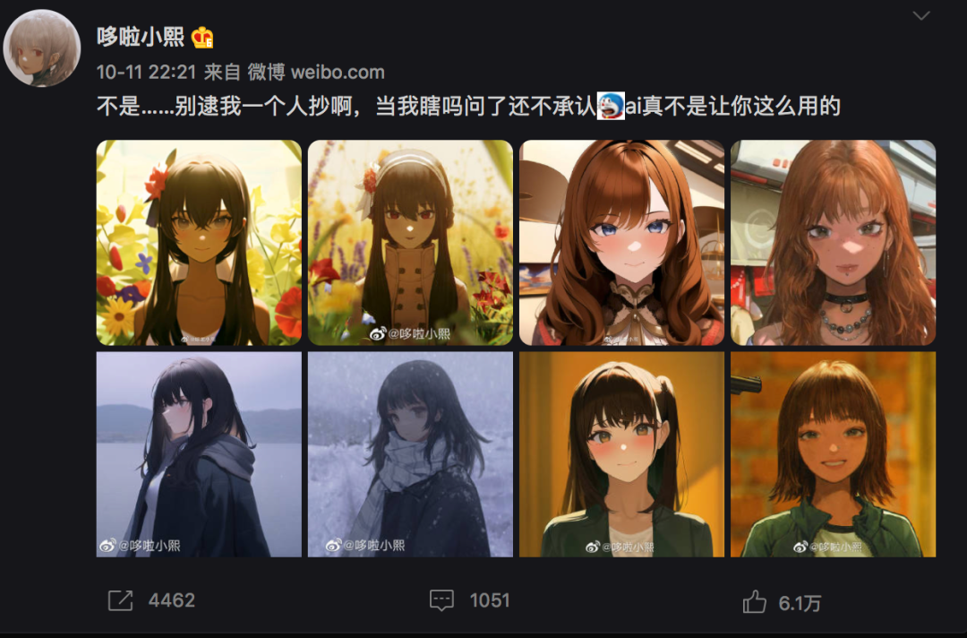 AI绘画的版权争执则转向另一种荒诞——AI剽窃画手,画手薅AI羊毛,网友搬运画手的AI绘画……形成一个明目张胆互相白嫖的奇怪局面。