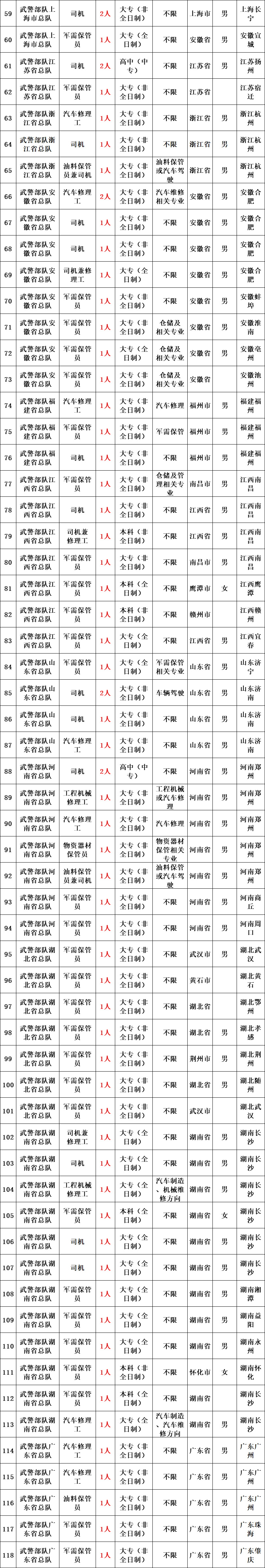 武警部队所属用人单位运输投送、装备维修、物资器材储存等专业技能三级以下文职人员岗位。