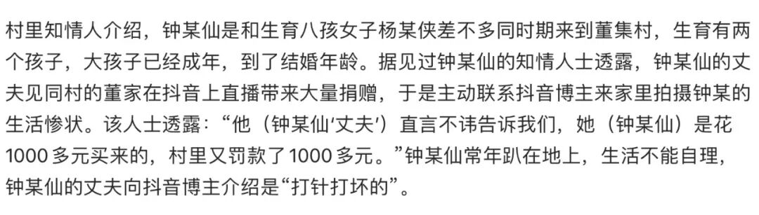 这意味着,如果婚姻确认无效的话,长达二十多年,生育八个孩子,构成长期、持续、多次地对女性精神病人实施强奸。同时,还构成虐待和非法拘禁。董某竟然不以为罪,不以为耻,反以为荣,事发后还利用网红身份接广告做代言?!当地普遍的价值观和风气,可见一斑。