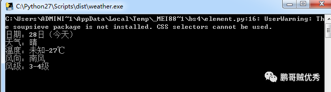 print(u"日期:{0} \n天气:{1} \n温度:{2} \n风向:{3} \n风级:{4}").format(date, weather, temp, wind, windnumber)