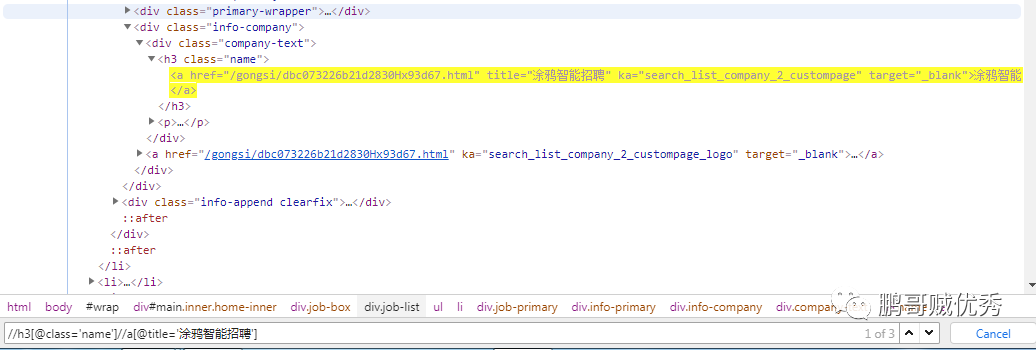 <a href="/gongsi/dbc073226b21d2830Hx93d67.html" title="涂鸦智能招聘" ka="search_list_company_2_custompage" target="_blank">涂鸦智能</a>因此我就想到了万能的元素查找方法:driver.find_element_by_xpath()但是由于自己对html不熟悉,经常出现找不到元素。这里教大家一个小技巧:通过F12的查找,将你自己的xpath代码输入进行查找。