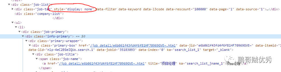 我要找这个“项目经理”元素,却就是找不到。这 里我们要仔细看下html代码了。看到没?网站设置了当前界面为style='display:none',就是这个style导致了selenium找不到。