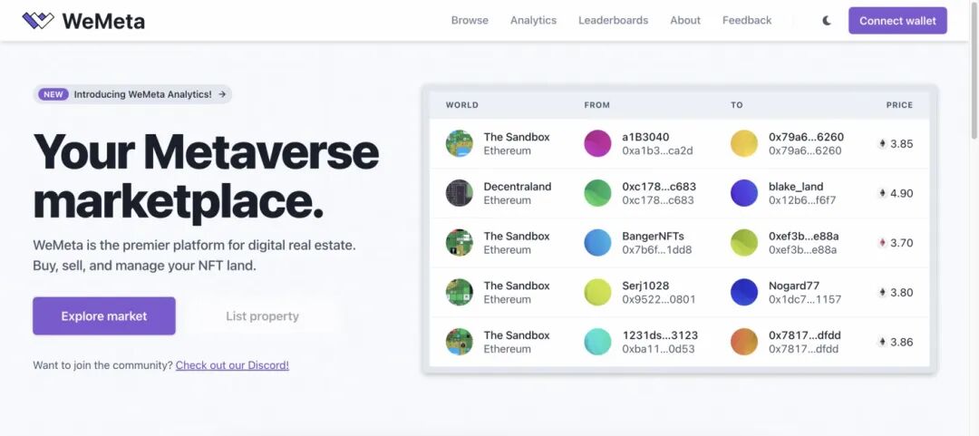 WeMeta 成立于 2021 年初,总部位于美国西海岸,当时出现的元宇宙地产数据服务商确实不多,WeMeta 是该领域的首批参与者之一。他们目前在 https://analytics.wemeta.world/welcome 提供免费的数据分析看板。他们官网提供了“四大”元宇宙项目(The Sandbox、Decentraland、Somnium Space 和 Cryptovoxels)的相关数据,包括:地板价、销售均价、活跃玩家数等,也可以查看当前在售的地块列表。