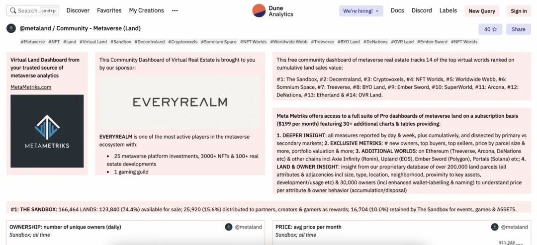 另一家成立于 2021 年的元宇宙数据分析公司是 MetaMetriks。他们的总部设在英国,并有其他国家的分析师为其服务。与 WeMeta 一样,他们也提供免费数据看板( http://dune.xyz/metaland/Metaverse-Land-Community ),该看板涵盖 14 个元宇宙项目,主要呈现地块 owner 数量、销售均价、销售额、个人交易记录等数据。