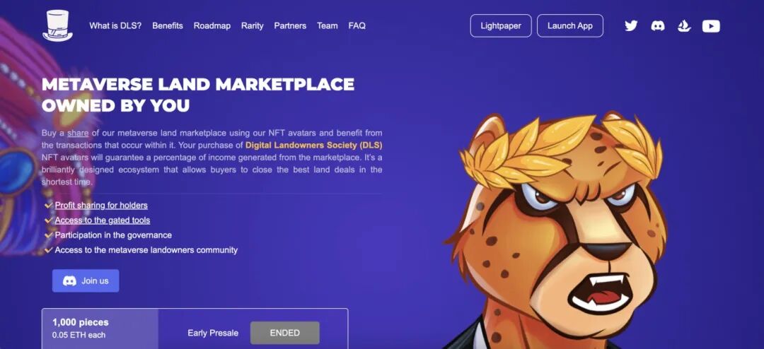 Digital Landowners Society (数字地主协会) 的产品形态与其他四家完全不同。要使用他们的分析工具,必须先购买他们的一个 NFT ,这样才可以解锁他们的工具和分析服务。这些 NFT 目前在 OpenSea 的售价是 0.119 ETH(约 373 美元),当然也可以在他们的官网上购买。购买后你收到的工具包括:Estate Finder、Interconnected Lands Finder、地价估值工具、自动出价机器人、“每日报告”以及地板价变化通知等。你还可以在 https://dls.so/tools 查看他们当前的产品和覆盖的元宇宙项目。