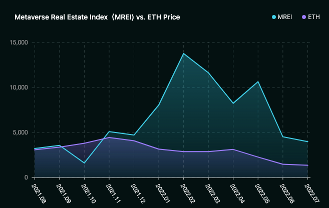 从MREI 指标和ETH的波动趋势图我们可以看出,7月MREI指数趋势几乎和ETH Price保持一致,均为小幅下降趋势,可以看出元宇宙版块的趋势和大市场背景不谋不合。