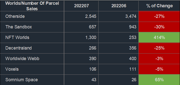 NFT Worlds销售数量从上月的253个地块上升至本月的1300个地块,涨幅高达414%,这个也能直接反应市场的消极情况,地价抛售的地主数量如此之多。