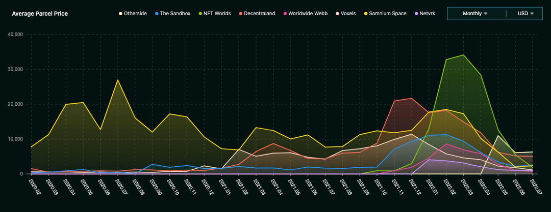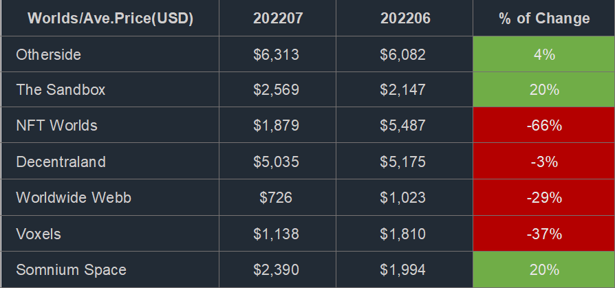 从月度均价波动图也可看出,NFT Worlds的7月均价(绿色)变动最剧烈。