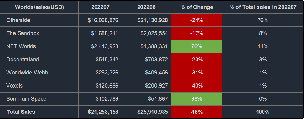 元宇宙版块(头部七大)的7月整体销售额和上月比下降了465万,降幅18%。