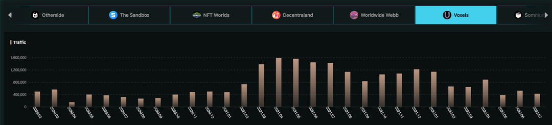 Decentraland的流量绝对值目前看是高于Voxels的,但是流量来源均为官方端口,由于不同平台统计口径可能不一致,可能横向对比结果不具有代表性,故目前仅供参考。