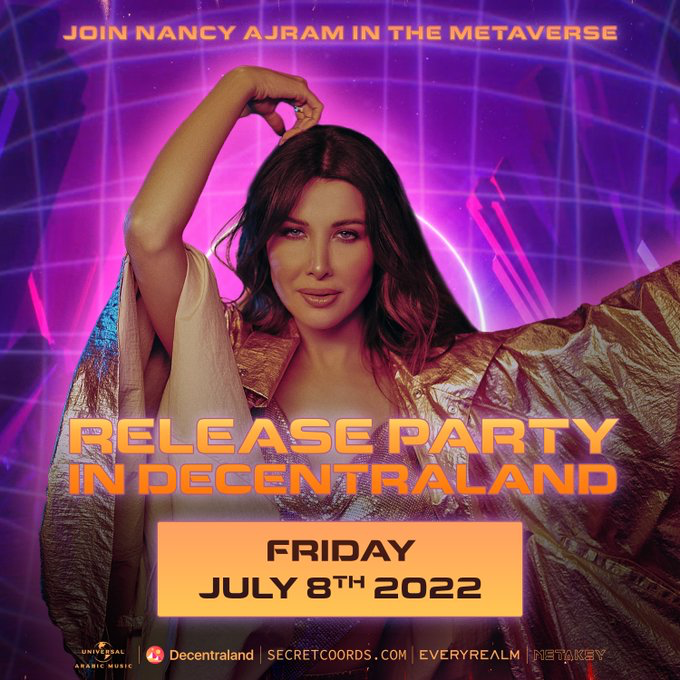 7月8日,歌手Nancy Ajram和Everyrealm合作在decentraland上为其新的单曲《SahSah》举办元宇宙派对。Nancy Ajram于1983年5月16日出生于黎巴嫩贝鲁特,黎巴嫩pop folk歌手。被认为是20年以来,阿拉伯世界最重要的超级明星。