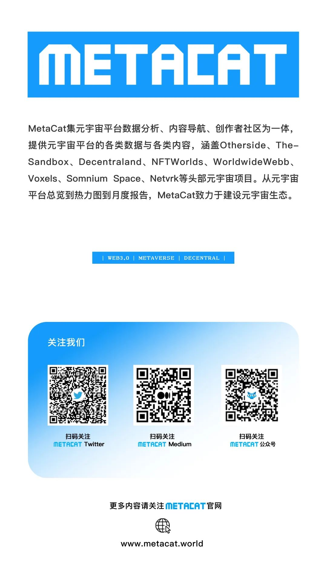 月度元宇宙数据分析报告包含七大元宇宙平台, The Sandbox 、 Decentraland 、 Voxels 、 Somnium Space 、NFT Worlds 、Worldwide Webb ,以及Otherside平台。