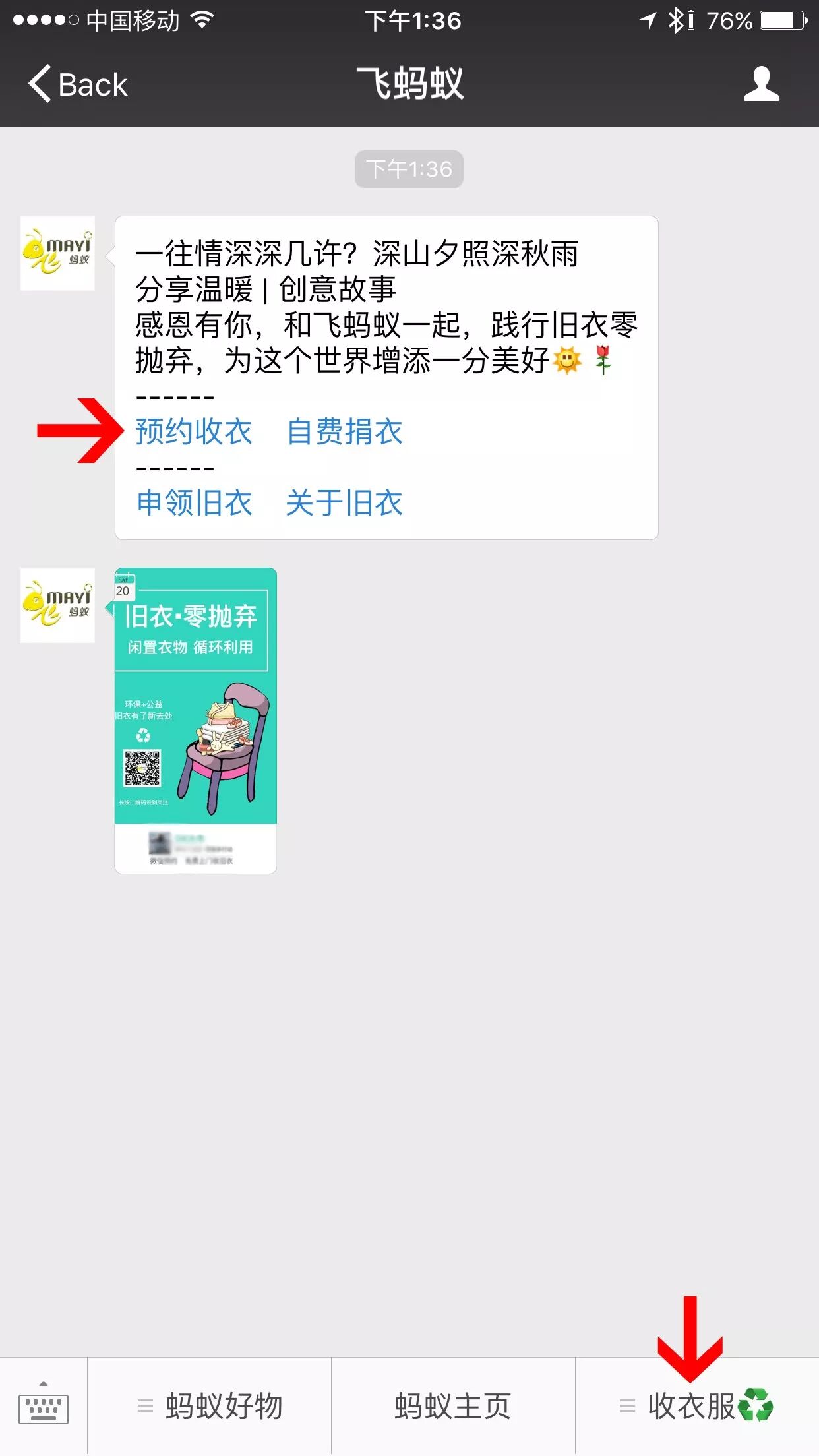 The automatic welcome message includes a link right to the reservation page... It's the first of the blue links, in Chinese 预约收衣:
