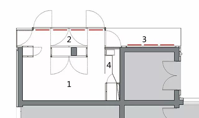 [ 1 展厅 2 视频展廊 3 室外视频展廊 4 操作间 ]