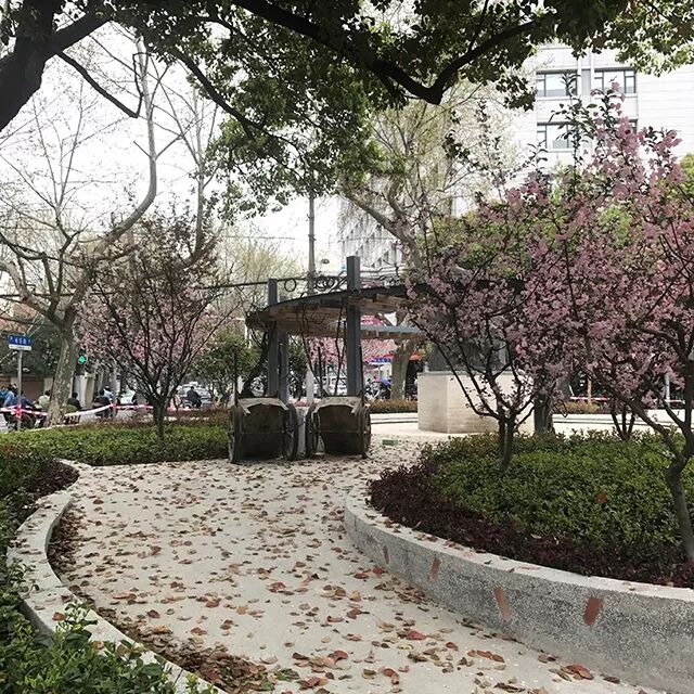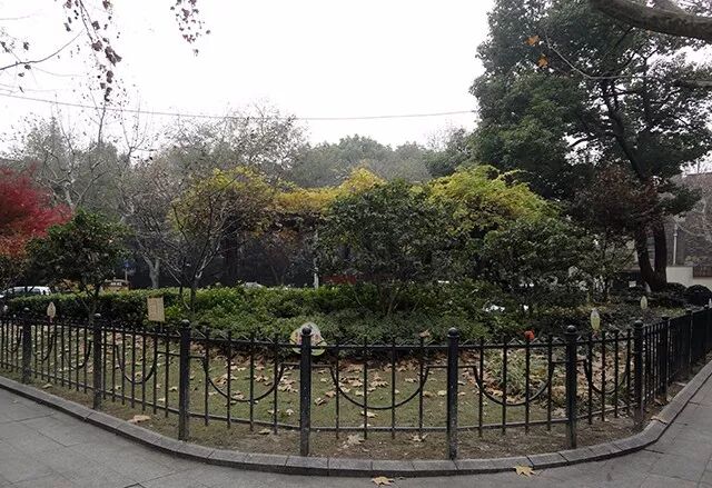 [田汉广场改造前,三面都被铁栏杆围住,只有很窄的小径通向内部的圆形广场]