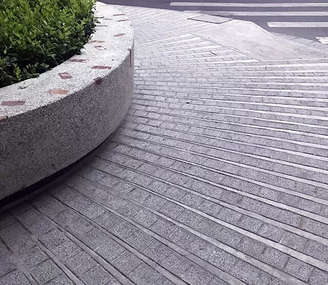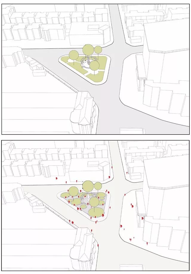 我们的改造策略是维持现有的绿化不变,将整个硬地部分抬高50公分——这样原来的栏杆就不再必要了(它原先的作用是防止踩踏绿化),并且自然在广场与人行道之间由高差形成了一圈可以休憩倚靠的混凝土坐凳;原来遮蔽在绿化之中的小径和广场也由于高度的提升而浮现出来,成为人们视线和行为可达的公共开放空间。