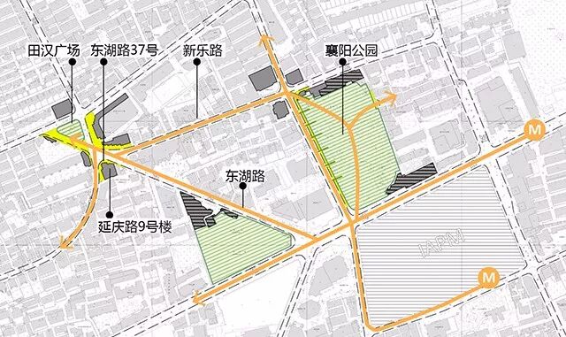 在2015年10月通过规划方案的专家评审之后,我们开始针对规划内容进行各项落实工作,主要是针对于第二部分的街区公共体系问题——一方面是一些实质性方案设计的深化,另一方面是参与各种相关协调工作,例如规划中提出的襄阳公园拆除围墙,形成开放性的公园,需要与负责襄阳公园改造方案设计的园林院进行沟通;又例如,为了提高田汉广场的公共性,也需要与规划和交通部门协调广场周边交通流线调整优化的可行性等等。