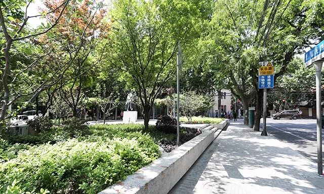 [田汉广场改造后,保留所有乔木和大型灌木,整个硬地部分抬高50公分,广场与人行道之间由高差形成了一圈可以休憩倚靠的混凝土坐凳;原来遮蔽在绿化之中小径和广场也由于高度的提升而浮现出来,成为人们视线和行为可达的公共开放空间]