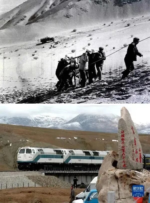 ▲拼版照片:上图为20世纪50年代拍摄的勘测青藏线的资料照片;下图为2006年7月1日,青藏铁路全线通车。这是从格尔木出发的“青1”次列车经过海拔4767米的昆仑山口(新华社记者侯德强摄)。新华社发
