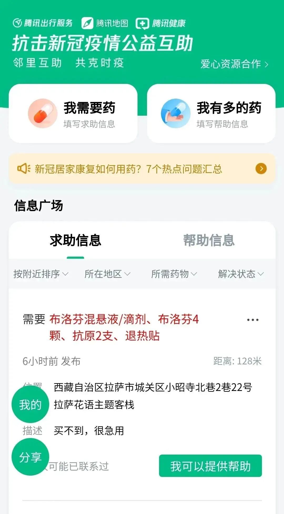 12月22日,西藏商报联合腾讯出行服务和腾讯地图发布了“新冠防护药物公益互助平台”。