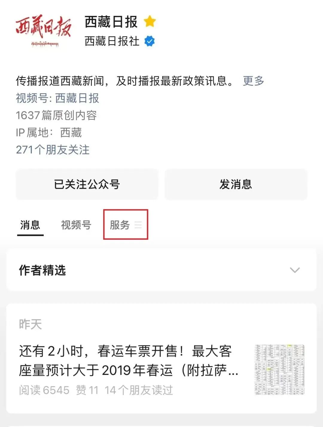 第一步:关注、进入“西藏日报”微信公众号,点击“服务”进入菜单栏。