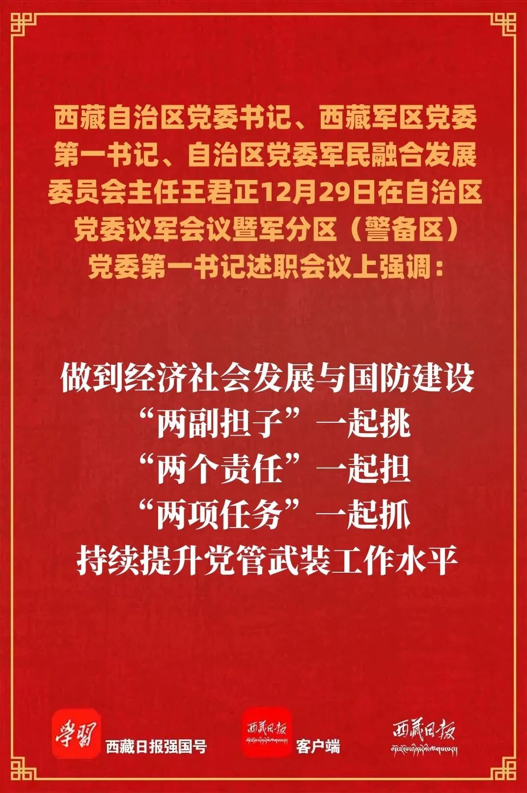 12月29日上午,自治区党委书记、西藏军区党委第一书记、自治区党委军民融合发展委员会主任王君正主持召开自治区党委议军会议暨军分区(警备区)党委第一书记述职会议,传达学习习近平总书记关于国防和军队建设的重要指示精神,听取各地市军分区(警备区)党委第一书记述职,安排部署2023年自治区固边稳藏、国防动员和双拥工作。强调,要深入学习贯彻党的二十大精神和习近平强军思想,坚决扛起党管武装政治责任,牢牢把握党管武装正确方向,深入推动军民融合发展,不断开创西藏长治久安和高质量发展新局面。