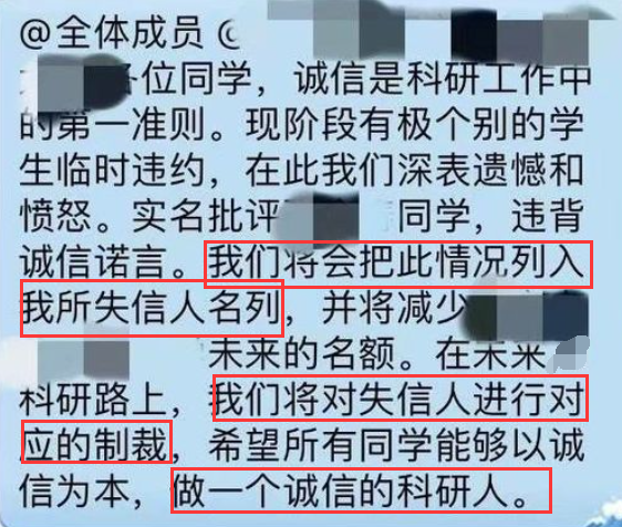 的还有这位某 211 高校导师,在前期,其在推免群里表示,已经将极个别临时违约的学生列入了失信人名列,并再次强调将对失信人做出制裁,希望同学们做诚信的科研人。