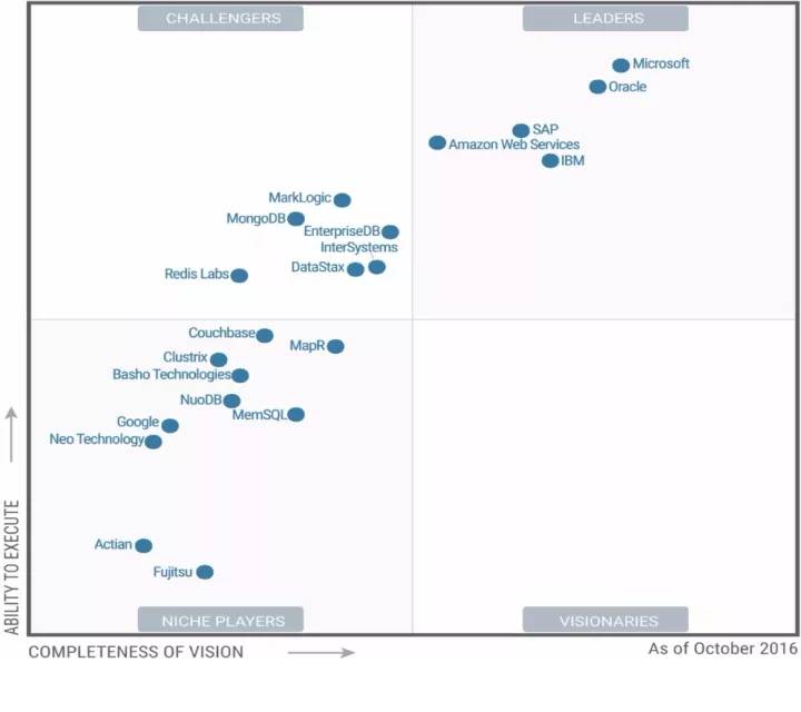 2017年操作型数据库管理系统OPDBMS的魔力象限最近公布了。这个OPDBMS主要适用于市面上多种关系型DBMS和非关系型DBMS,以云端和托管的解决方案为核心。Gartner之所以引入这个类别,主要还是凸显了目前云端的数据管理平台的重要性。
