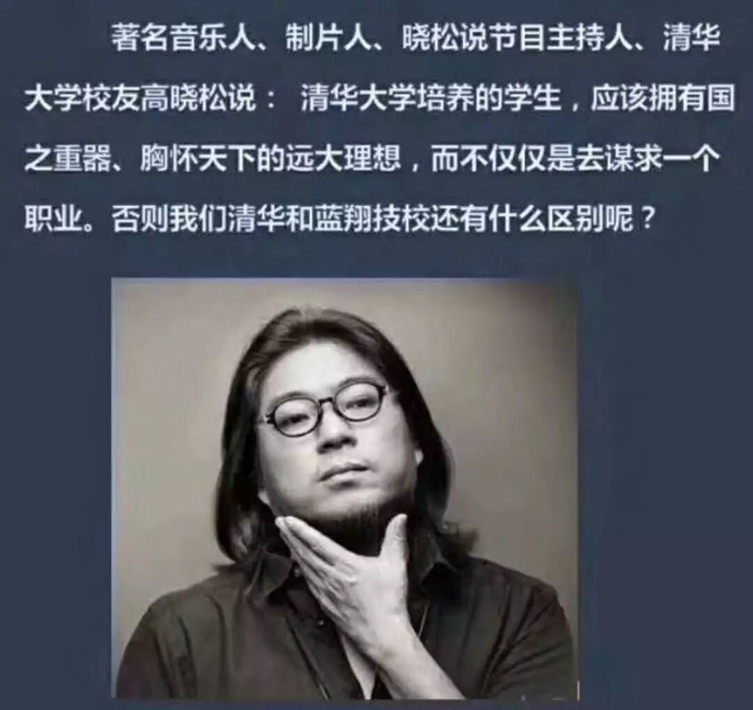 所以能够进清华的大部分人,当然都具备了务虚的资格,以天下为己任。能够去蓝翔技校的人,无非是谋个温饱,自然要脚踏实地的务实。彼此来看都算不得错。